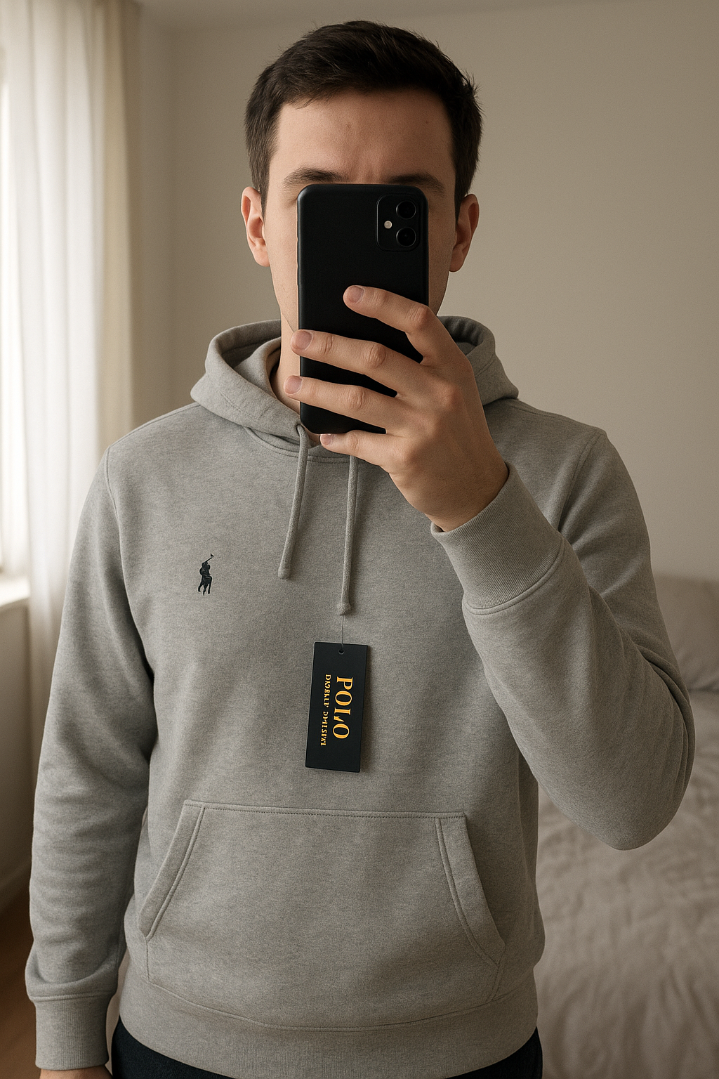 Col roulé debout, face à la caméra, dans une chambre à la lumière douce, avec une lumière naturelle filtrant par la fenêtre.