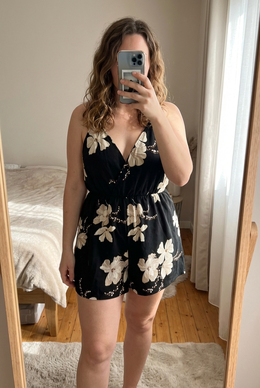 Combi short taille xxl debout, face à la caméra, dans une chambre à la lumière douce, avec une lumière naturelle filtrant par la fenêtre.