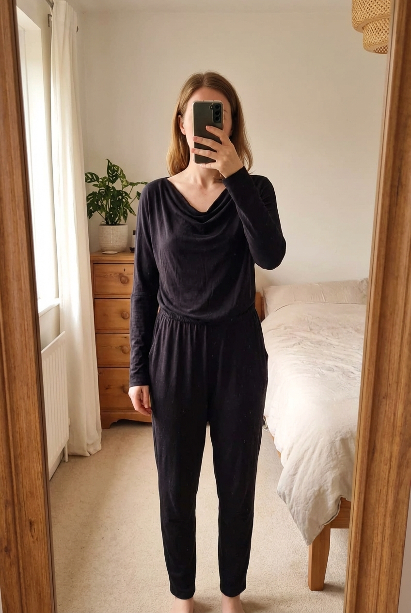 Une personne en Combinaison manches longues - femme - M - Pieces debout, face à la caméra, dans une chambre à la lumière douce, avec une lumière naturelle filtrant par la fenêtre.