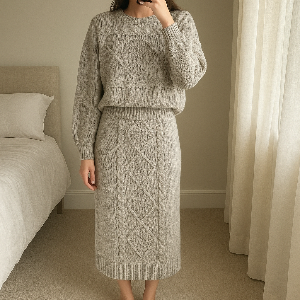 Una persona con Conjunto de lana con falda gris de pie, mirando a la cámara, con tipo de cuerpo delgado, en un dormitorio con luz suave y natural filtrándose por la ventana.