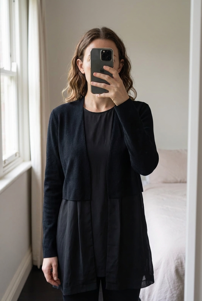 Cos size Large cardigan black with chiffon bottom standing straight facing the camera, in a softly lit bedroom setting, with gentle natural light filtering through a window.