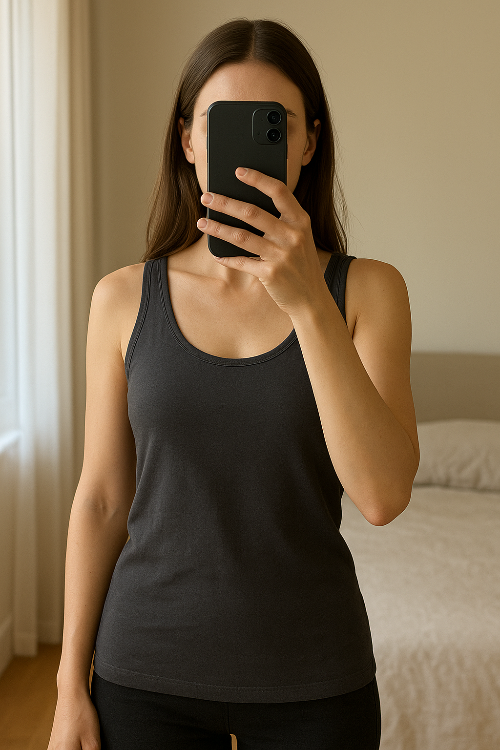 Débardeur Comptoir des Cotonniers XS – 100% coton, gris anthracite debout, face à la caméra, dans une chambre à la lumière douce, avec une lumière naturelle filtrant par la fenêtre.