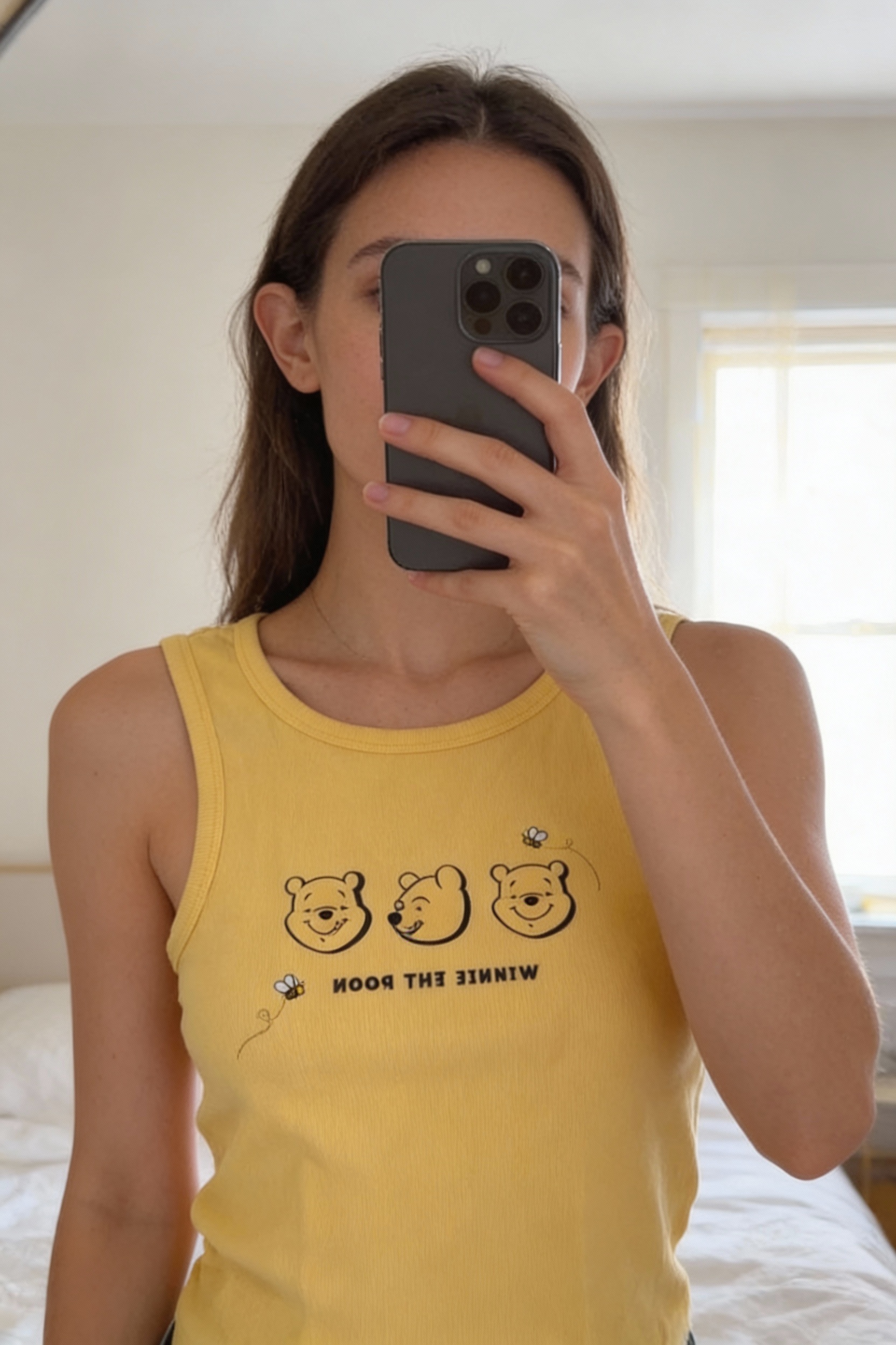 💛 Débardeur Disney Winnie l’Ourson – Femme – Taille 2XS debout, face à la caméra, dans une chambre à la lumière douce, avec une lumière naturelle filtrant par la fenêtre.