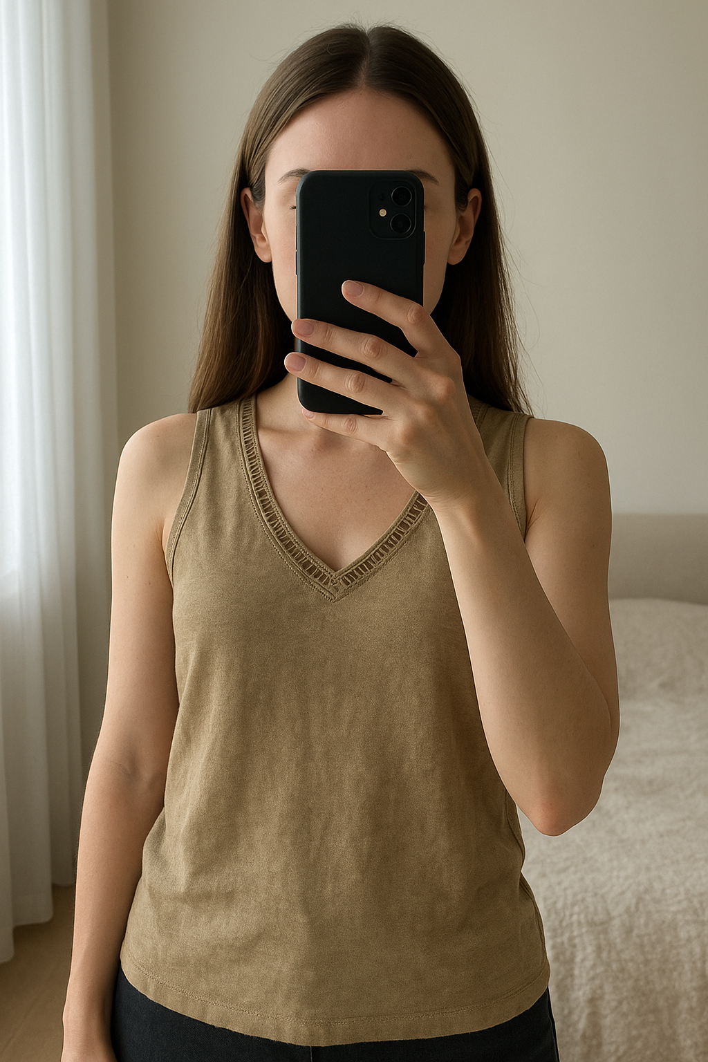 Débardeur taille s marque only debout, face à la caméra, dans une chambre à la lumière douce, avec une lumière naturelle filtrant par la fenêtre.
