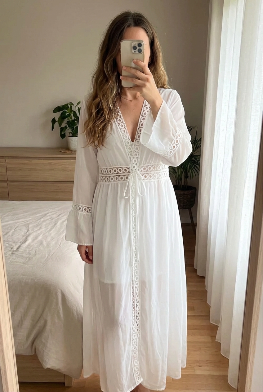 Déshabillé sexy ou longue Tunique blanche debout, face à la caméra, dans une chambre à la lumière douce, avec une lumière naturelle filtrant par la fenêtre.
