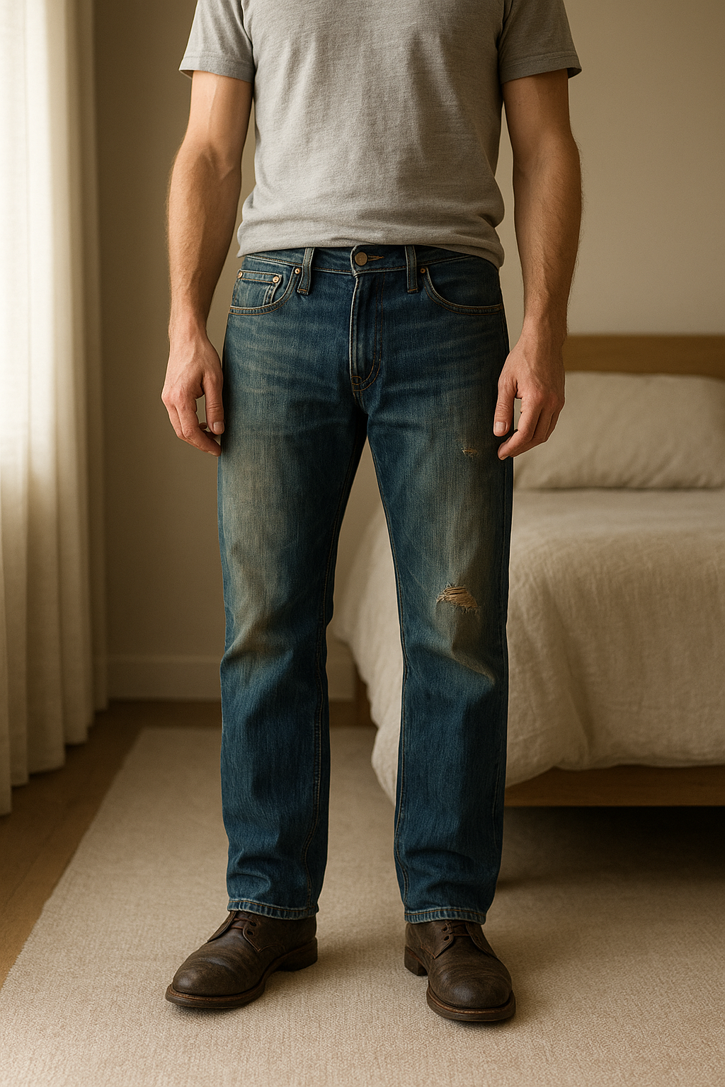 Diesel jean archive faded opium distressed Hadi slimane debout, face à la caméra, dans une chambre à la lumière douce, avec une lumière naturelle filtrant par la fenêtre.
