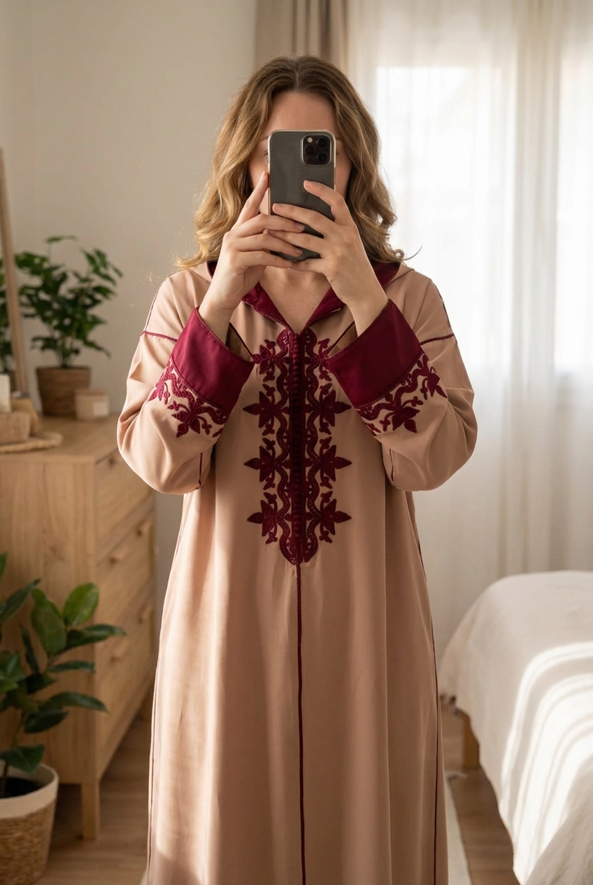 Djellaba jellaba neuve marron claire bordeaux taille M L debout, face à la caméra, dans une chambre à la lumière douce, avec une lumière naturelle filtrant par la fenêtre.