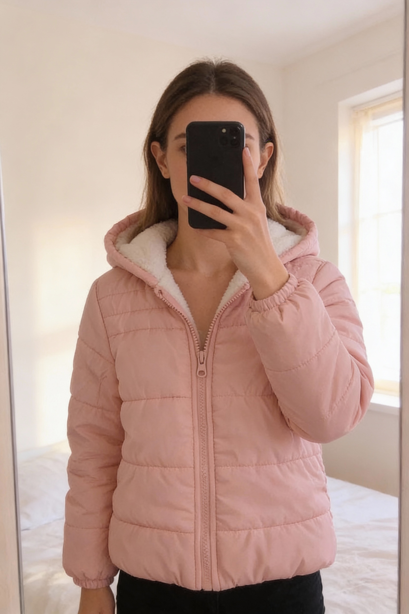 Doudoune bébé rose clair à capuche debout, face à la caméra, dans une chambre à la lumière douce, avec une lumière naturelle filtrant par la fenêtre.