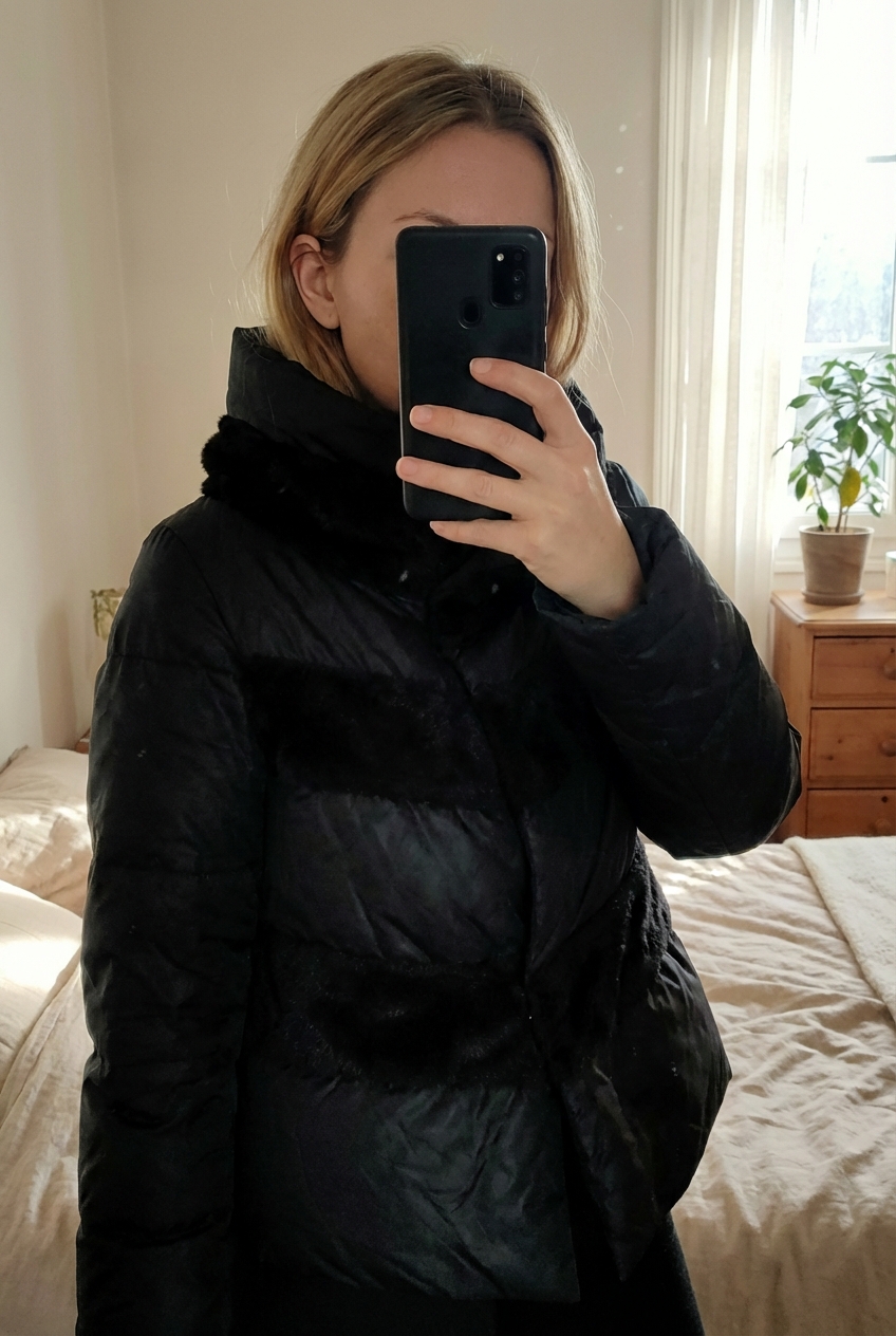 Doudoune courte bi-matière debout, face à la caméra, dans une chambre à la lumière douce, avec une lumière naturelle filtrant par la fenêtre.