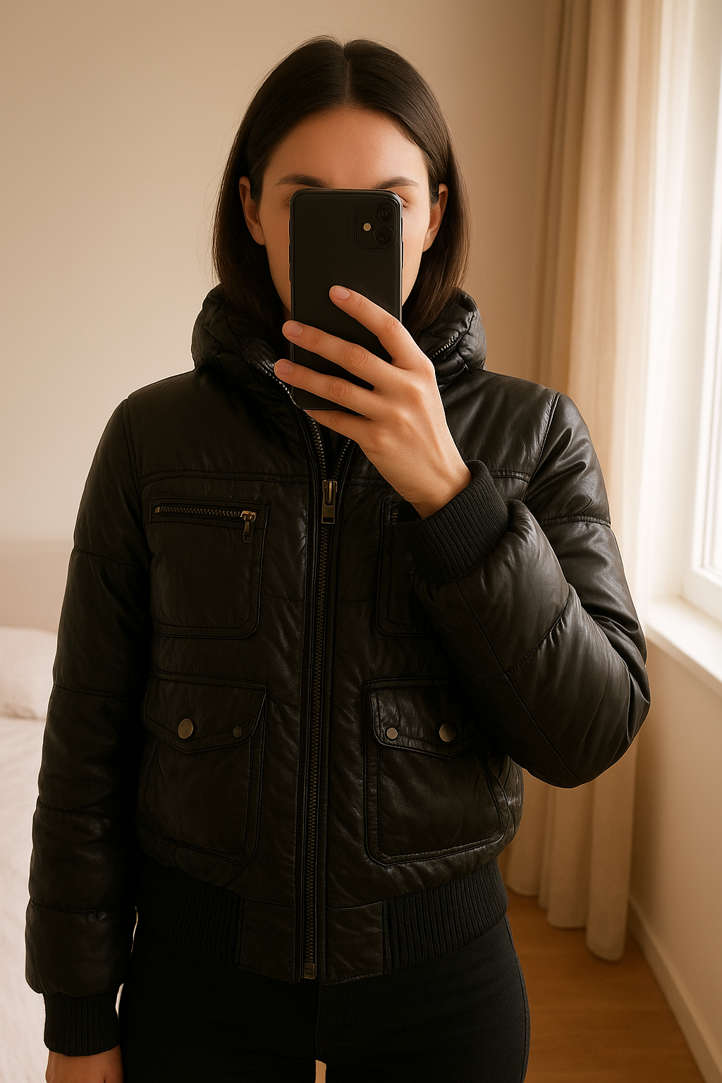 Doudoune femme courte noir T40 debout, face à la caméra, dans une chambre à la lumière douce, avec une lumière naturelle filtrant par la fenêtre.