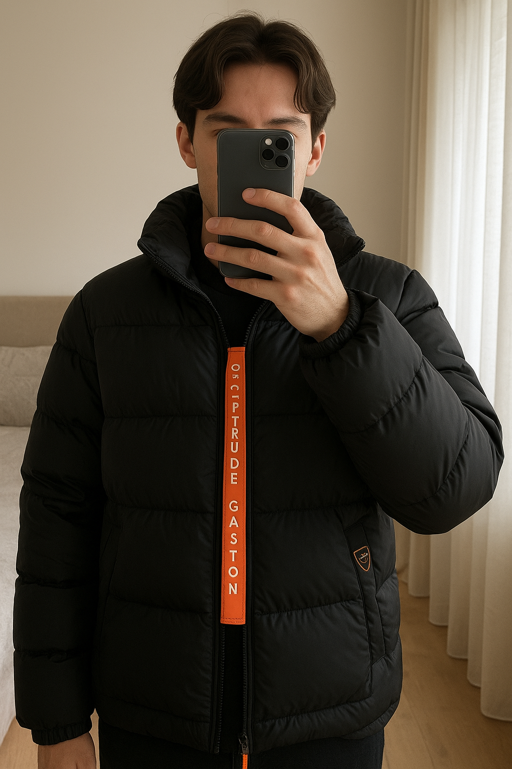 Doudoune Gertrude& Gaston noir mixte debout, face à la caméra, dans une chambre à la lumière douce, avec une lumière naturelle filtrant par la fenêtre.