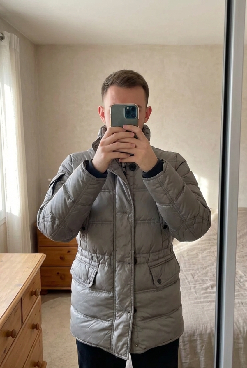 Doudoune Moncler 12 ans debout, face à la caméra, dans une chambre à la lumière douce, avec une lumière naturelle filtrant par la fenêtre.