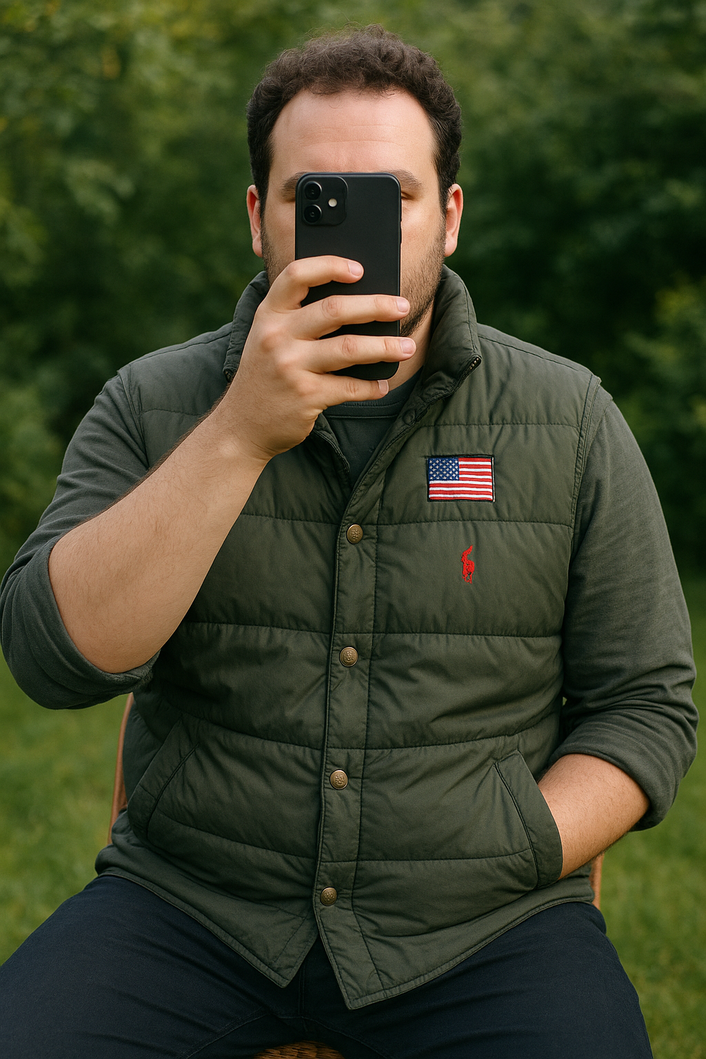 Une personne en Doudoune Ralph Lauren assis sur une chaise haute, avec une posture détendue, avec une silhouette légèrement plus ronde, en extérieur, dans un cadre naturel entouré de verdure et de lumière douce.