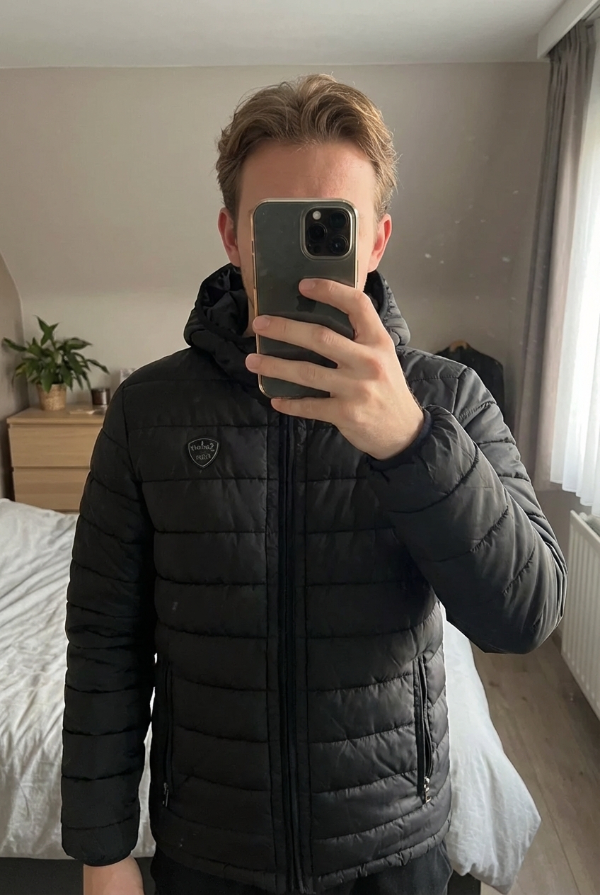 Doudoune Schott Homme debout, face à la caméra, dans une chambre à la lumière douce, avec une lumière naturelle filtrant par la fenêtre.