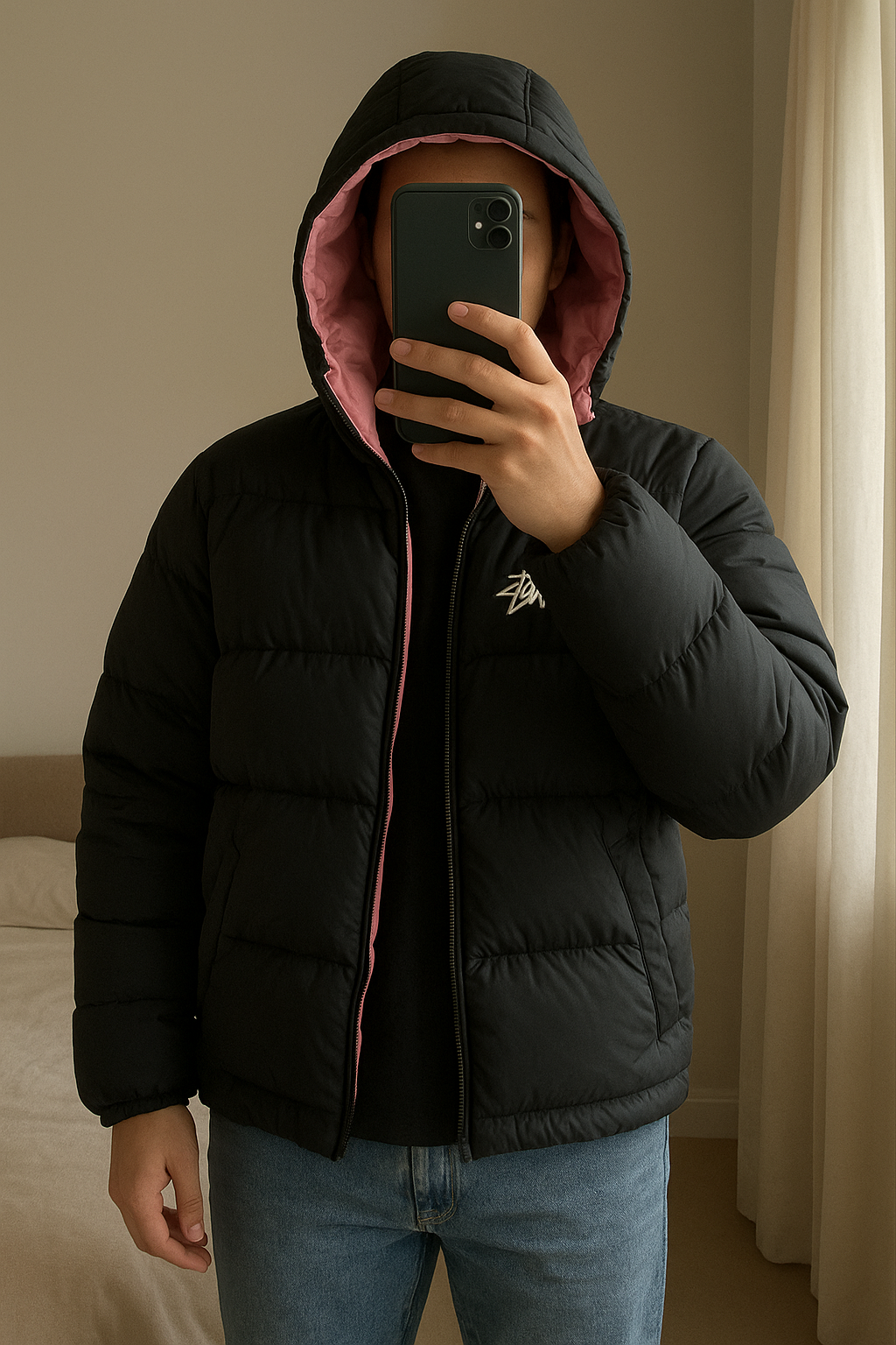 Doudoune stussy (intérieur rose) debout, face à la caméra, dans une chambre à la lumière douce, avec une lumière naturelle filtrant par la fenêtre.