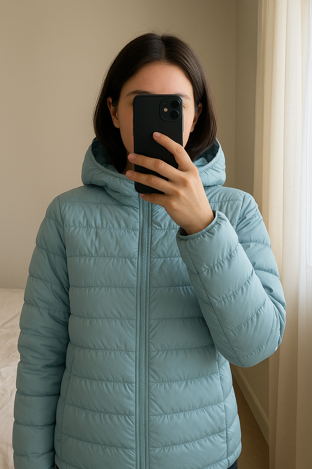Doudoune TEX bébé bleu clair 12 mois debout, face à la caméra, dans une chambre à la lumière douce, avec une lumière naturelle filtrant par la fenêtre.