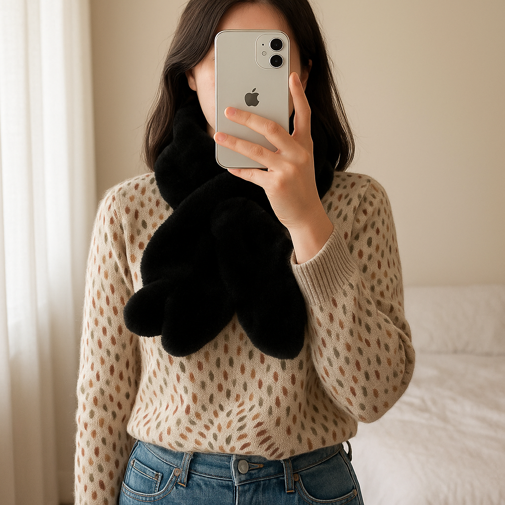 Echarpe tour de cou debout, face à la caméra, dans une chambre à la lumière douce, avec une lumière naturelle filtrant par la fenêtre.