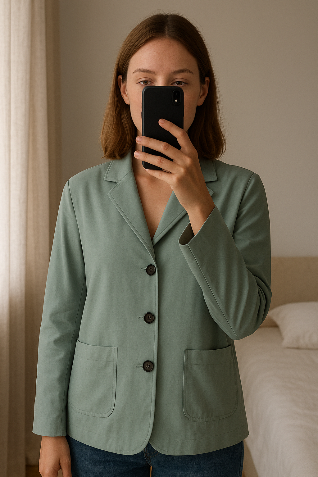 Ensemble blazer et pantalon Femme debout, face à la caméra, dans une chambre à la lumière douce, avec une lumière naturelle filtrant par la fenêtre.