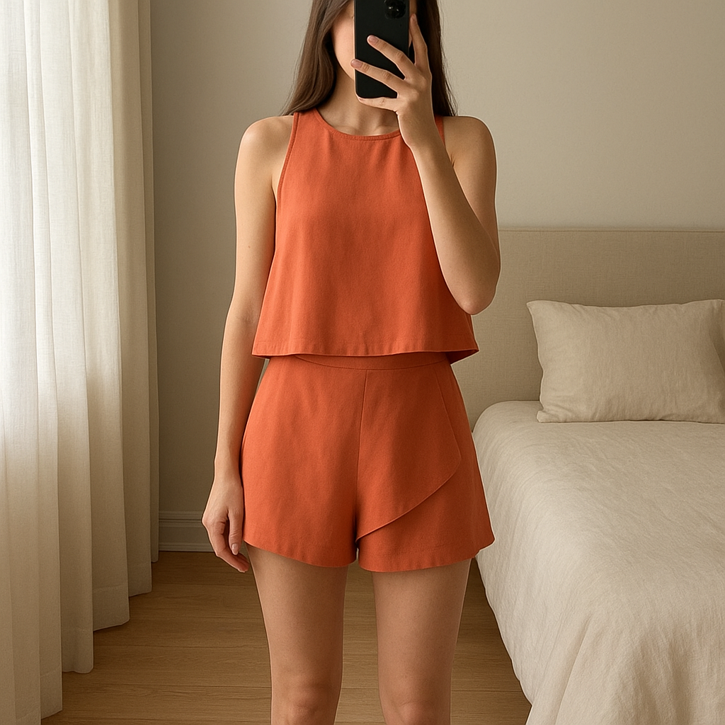 ensemble Emery rose T36 debout, face à la caméra, dans une chambre à la lumière douce, avec une lumière naturelle filtrant par la fenêtre.