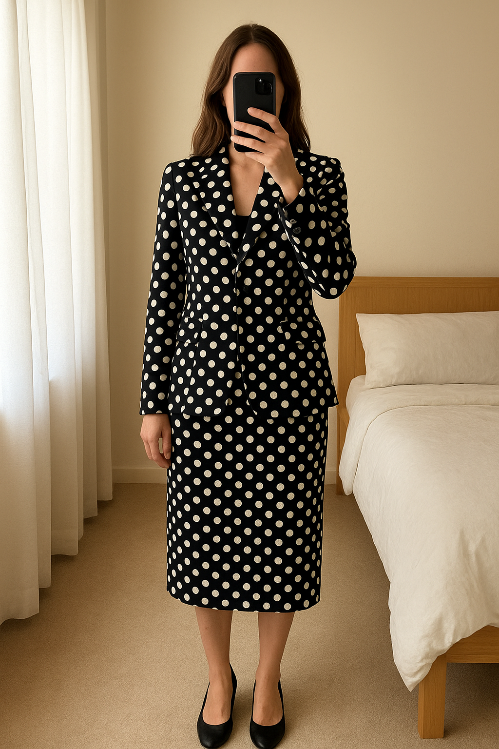 Ensemble jupe et blazer Yves saint Laurent debout, face à la caméra, dans une chambre à la lumière douce, avec une lumière naturelle filtrant par la fenêtre.