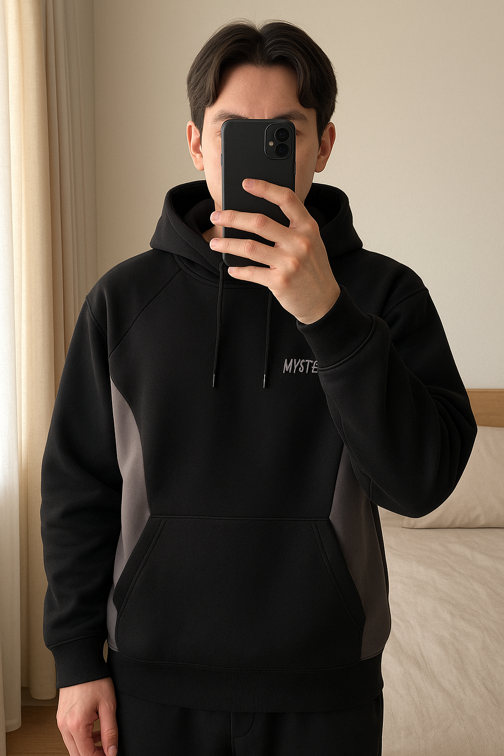 Ensemble Mertra debout, face à la caméra, dans une chambre à la lumière douce, avec une lumière naturelle filtrant par la fenêtre.