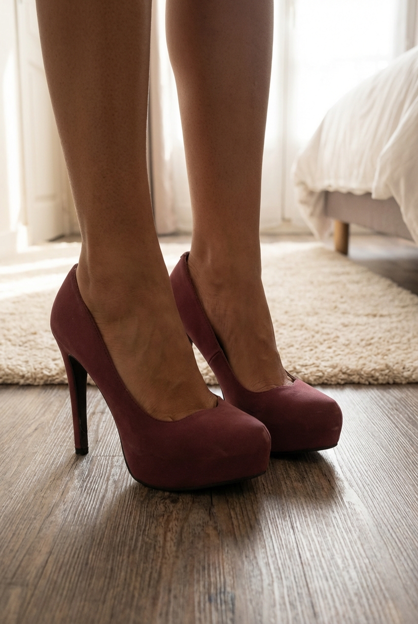 Une personne en Escarpins à plate-forme justfab violer T39 talon 12cm debout, face à la caméra, dans une chambre à la lumière douce, avec une lumière naturelle filtrant par la fenêtre.