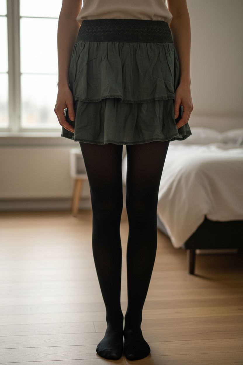 Falda Brownie de pie, mirando a la cámara, en un dormitorio con luz suave y natural filtrándose por la ventana.