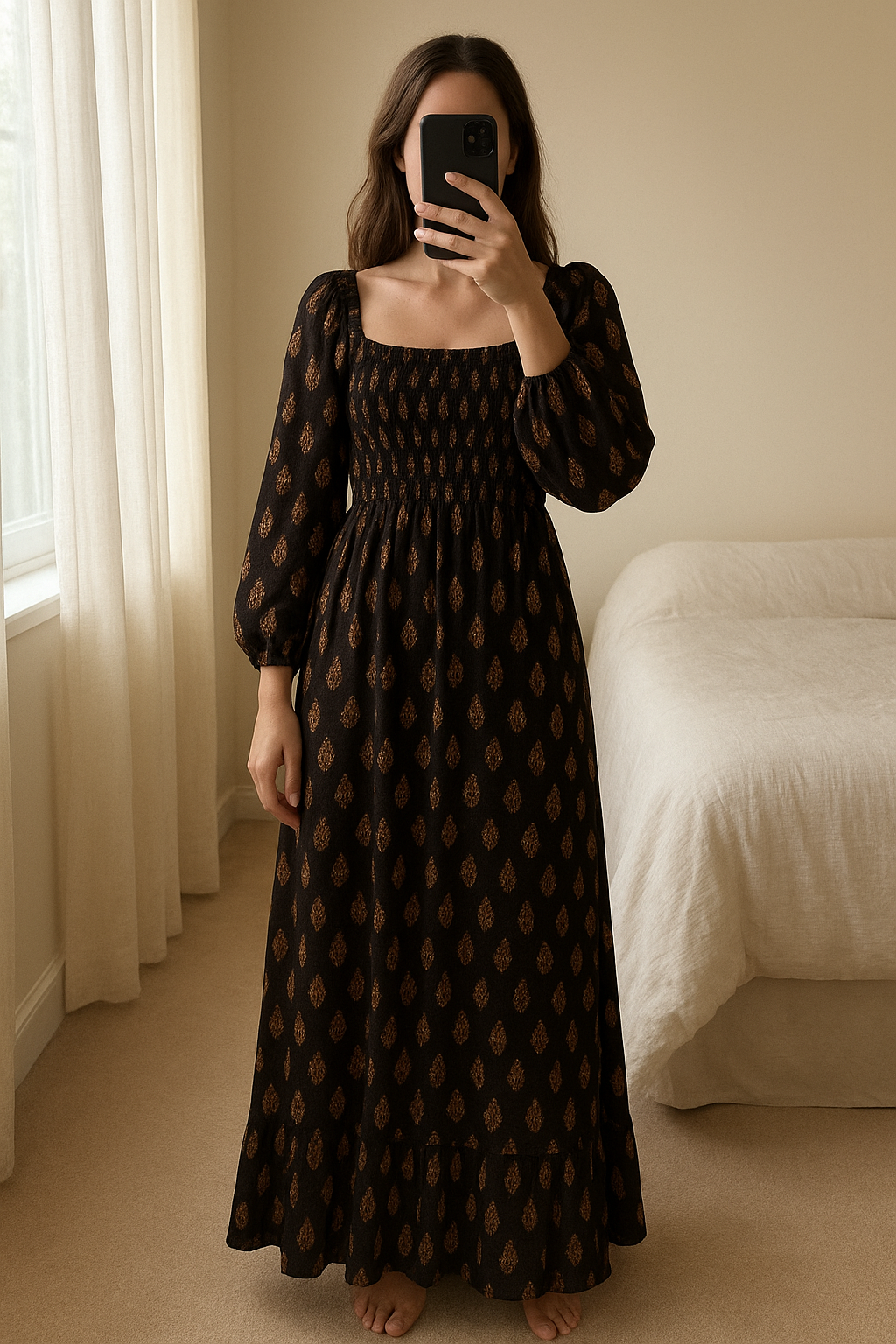 FatFace Maxi-Dress | Size 16 standing straight facing the camera, in a softly lit bedroom setting, with gentle natural light filtering through a window.