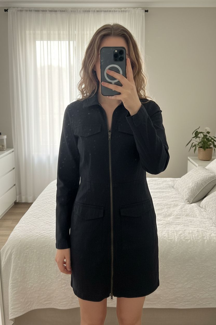 Femme Luxe Black Zip-Up Denim Utility Midi Dress Size 8 New Without Tags standing straight facing the camera, in a softly lit bedroom setting, with gentle natural light filtering through a window.