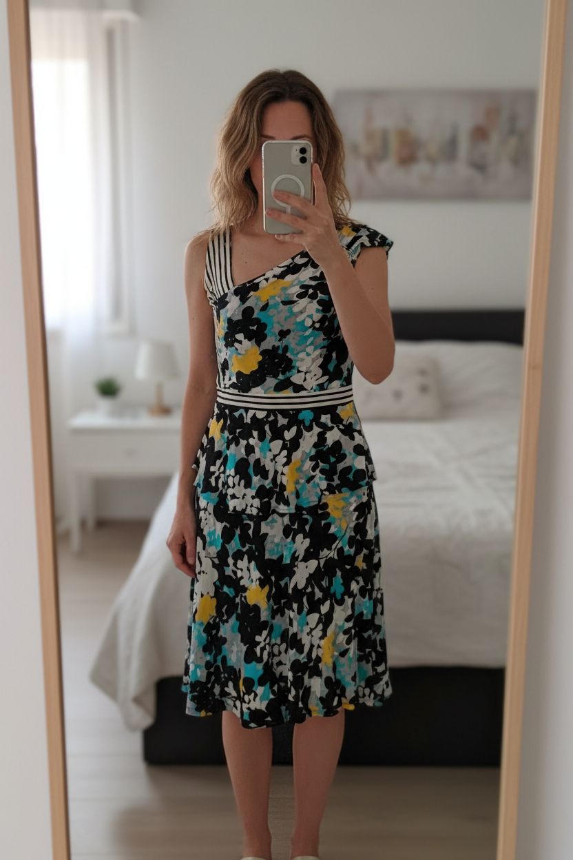 Floral summer dress Marella debout, face à la caméra, dans une chambre à la lumière douce, avec une lumière naturelle filtrant par la fenêtre.