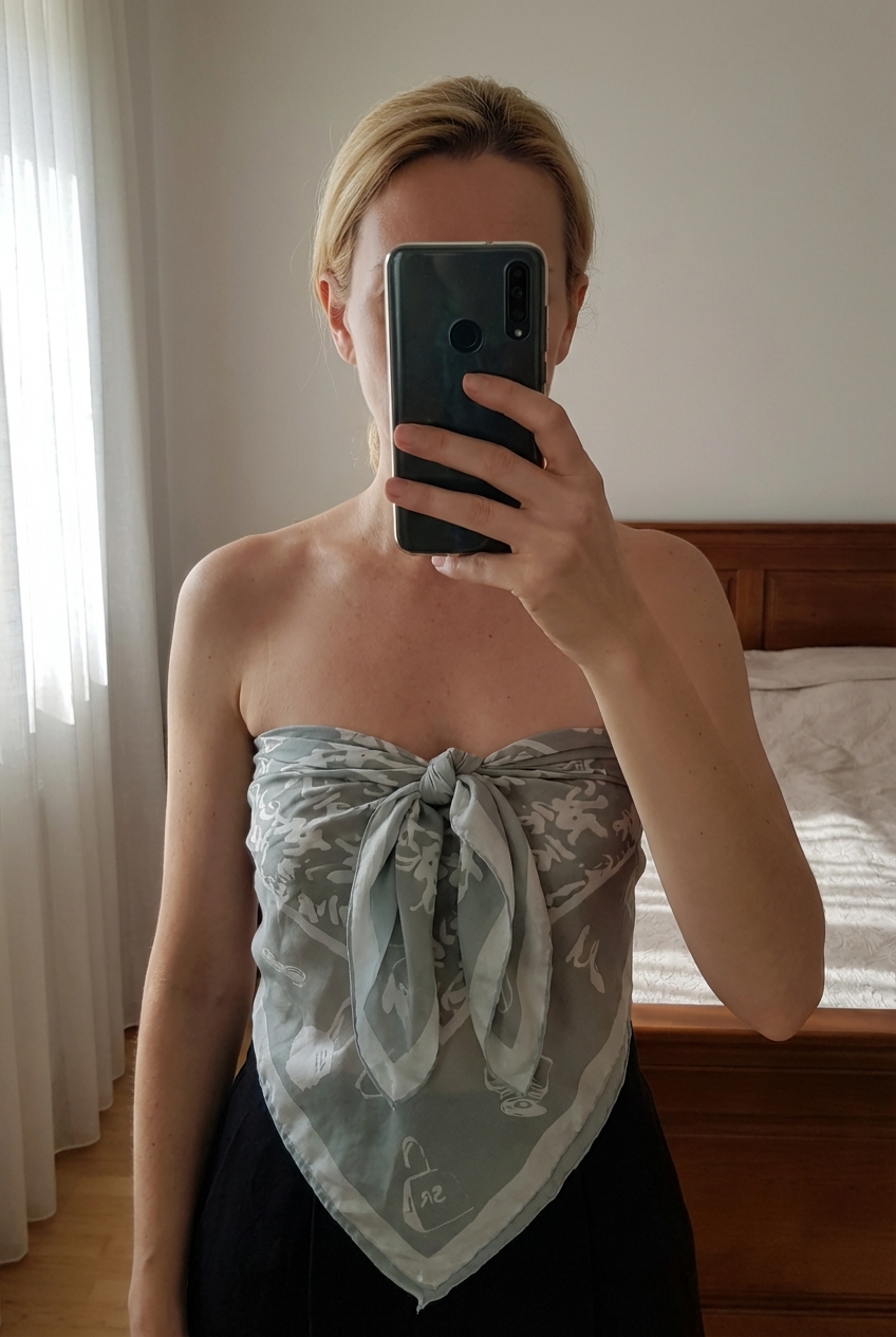 Foulard Sonia Rykiel debout, face à la caméra, dans une chambre à la lumière douce, avec une lumière naturelle filtrant par la fenêtre.