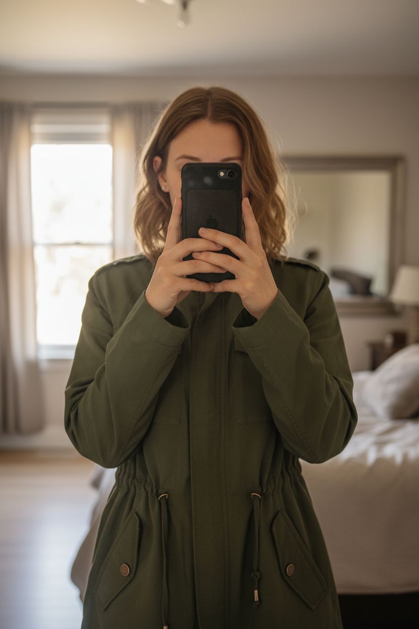 Gabardina cortavientos corta perfecto estado 💚 de pie, mirando a la cámara, en un dormitorio con luz suave y natural filtrándose por la ventana.