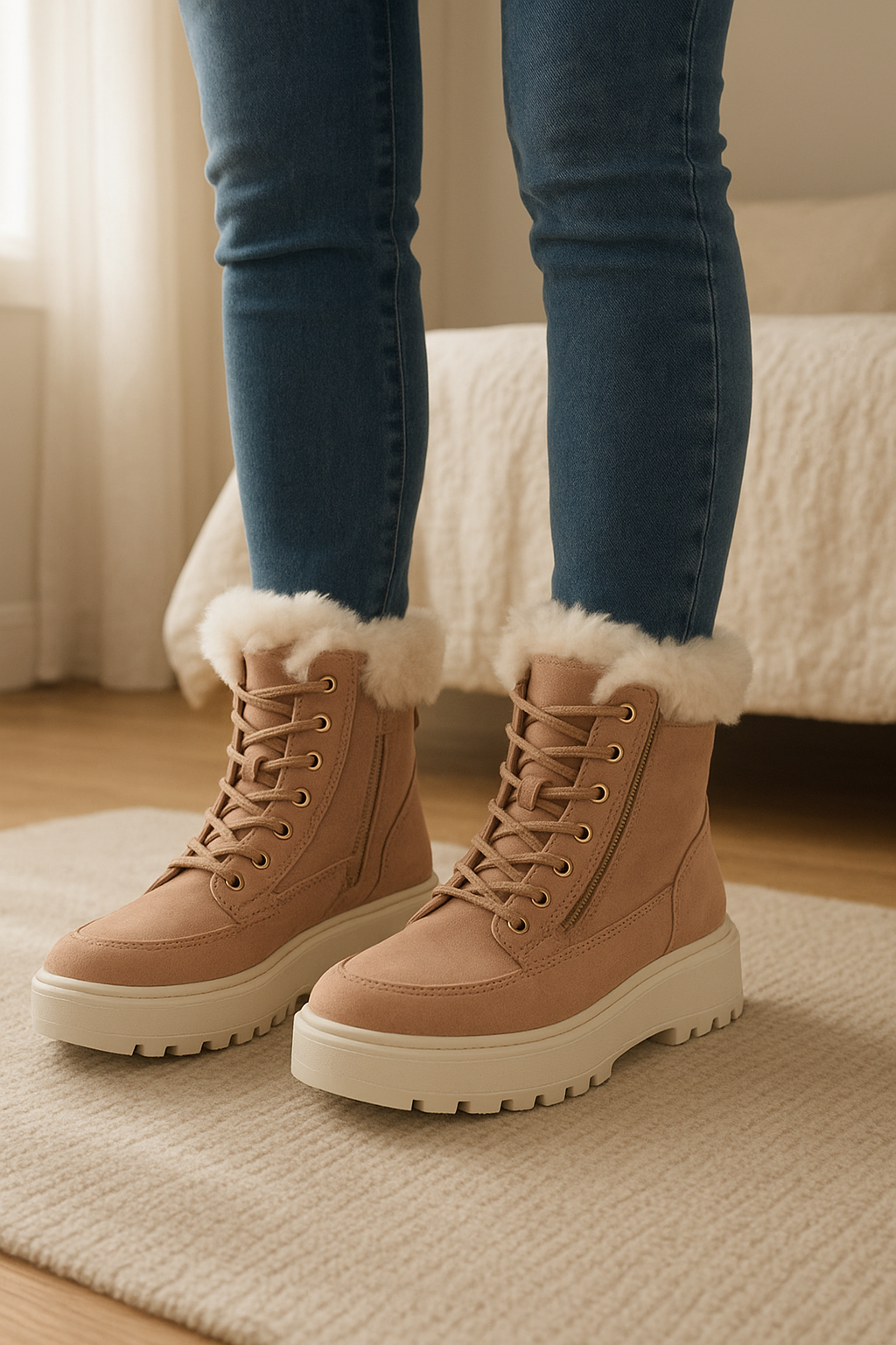 Geox - Bottes de neige - marron foncé debout, face à la caméra, dans une chambre à la lumière douce, avec une lumière naturelle filtrant par la fenêtre.