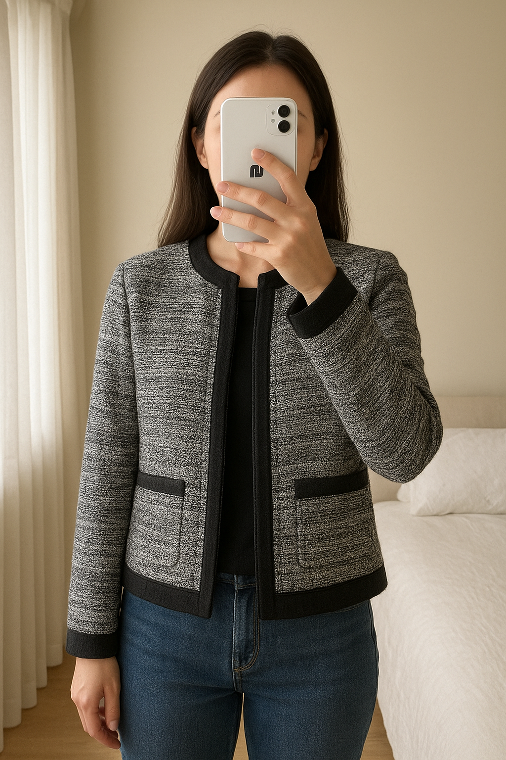 Giacca corta Comptoir des Cotonniers senza colletto maniche lunghe in piedi, rivolto verso la fotocamera, in una camera da letto con luce soffusa e luce naturale che filtra dalla finestra.