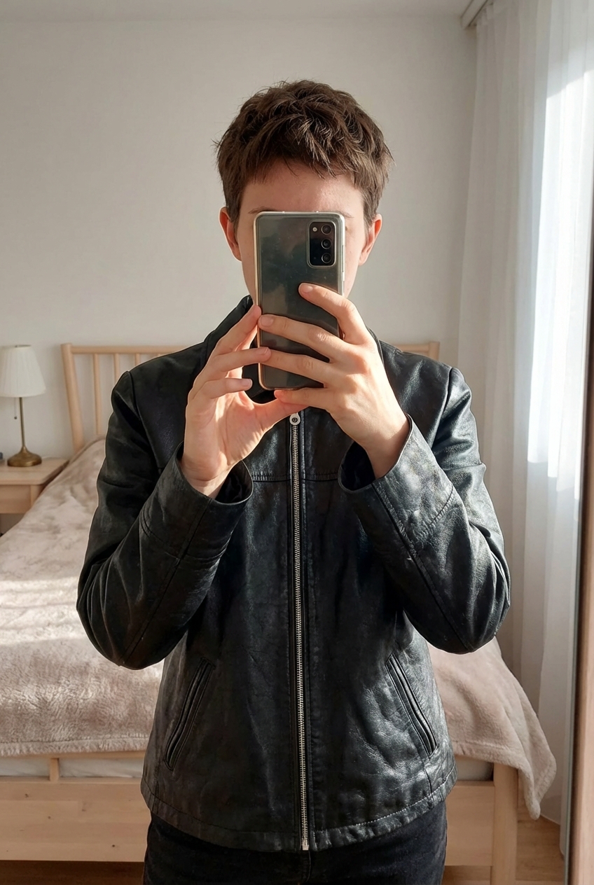 🖤 Giacca in vera pelle nera – R.I. Clothing Co. in piedi, rivolto verso la fotocamera, in una camera da letto con luce soffusa e luce naturale che filtra dalla finestra.