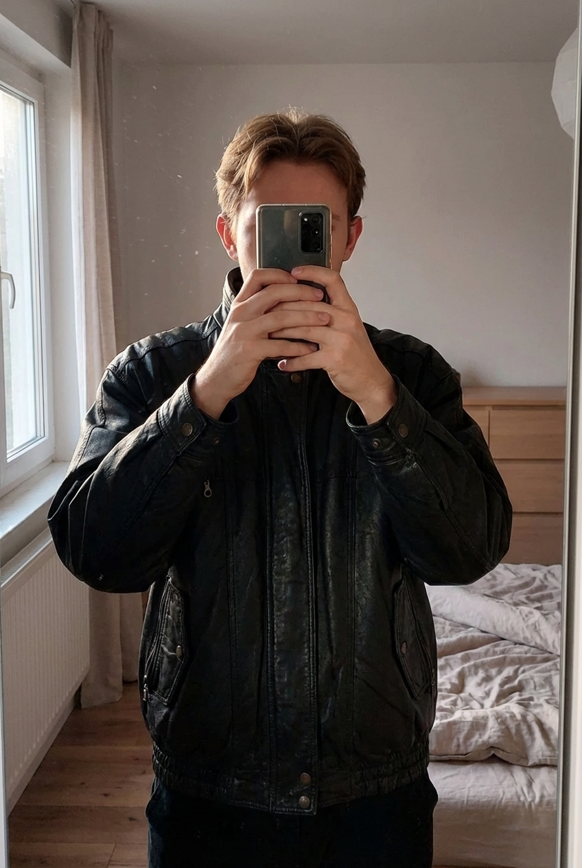 🖤 Giacca in vera pelle vintage oversize – carattere autentico 🖤 in piedi, rivolto verso la fotocamera, in una camera da letto con luce soffusa e luce naturale che filtra dalla finestra.