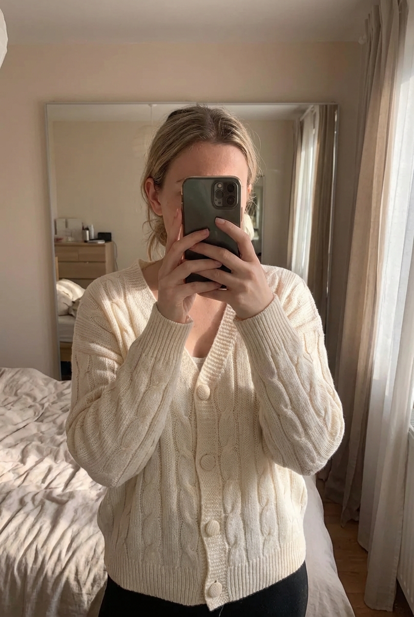 Gilet blanc à bouton femme debout, face à la caméra, dans une chambre à la lumière douce, avec une lumière naturelle filtrant par la fenêtre.