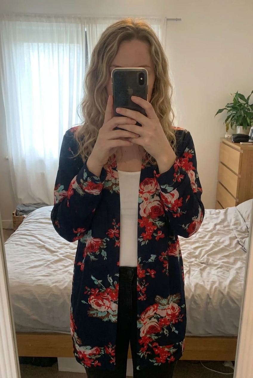 Gilet à fleurs rouges debout, face à la caméra, dans une chambre à la lumière douce, avec une lumière naturelle filtrant par la fenêtre.