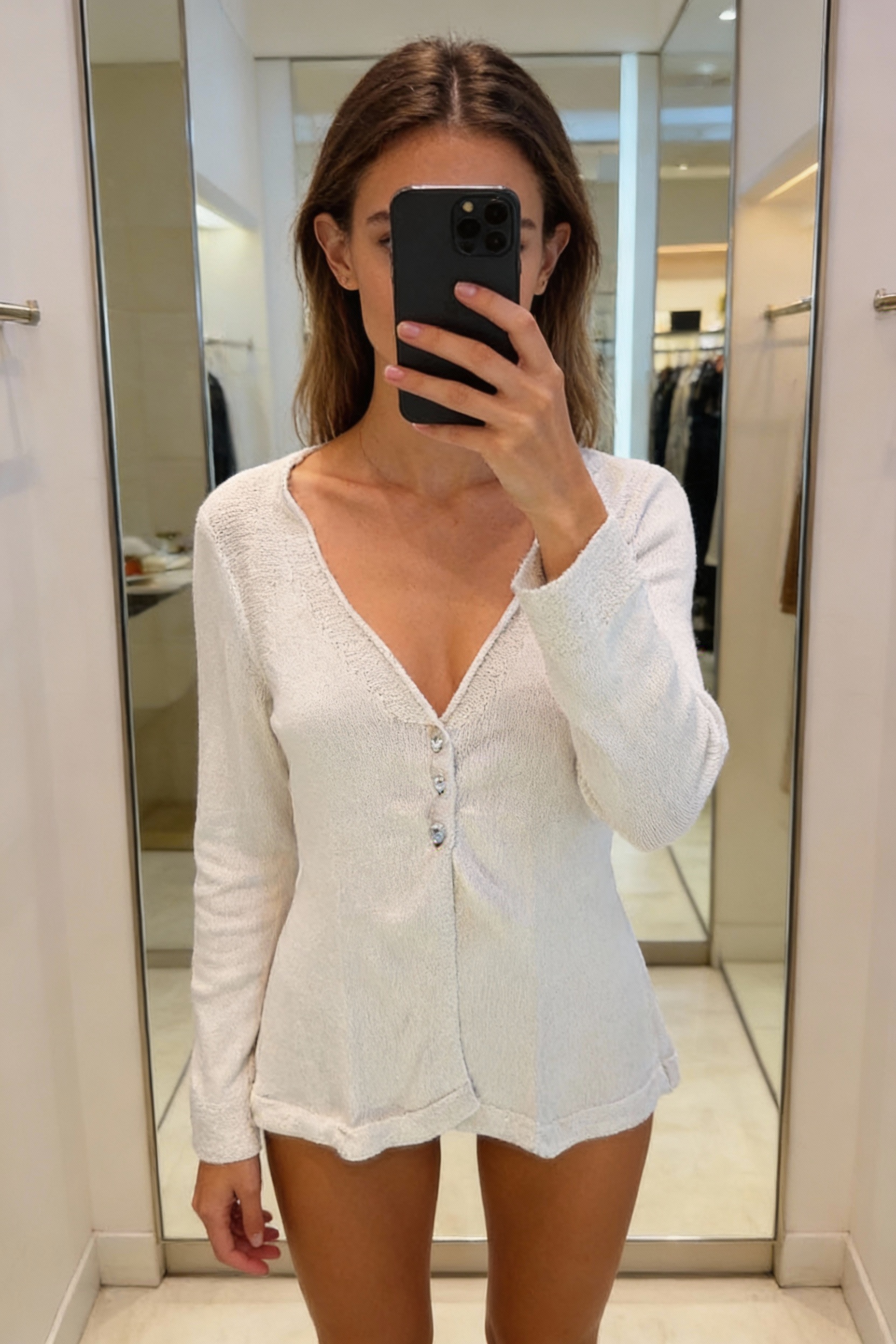 Une personne en Gilet Gérard darel debout, face à la caméra, avec une silhouette fine, dans une cabine d’essayage de style boutique avec un miroir et une décoration neutre.