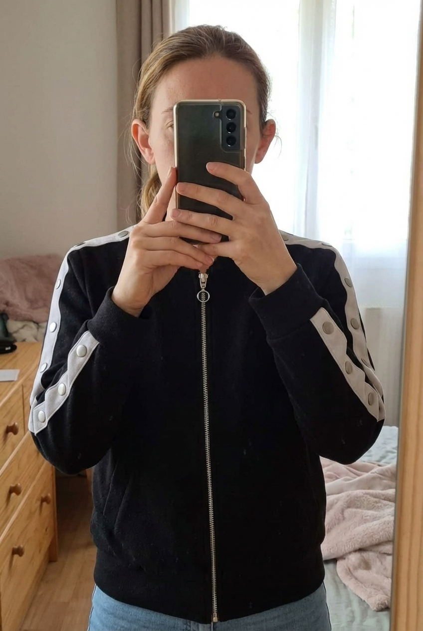 Gilet ikks taille XXS noir debout, face à la caméra, dans une chambre à la lumière douce, avec une lumière naturelle filtrant par la fenêtre.