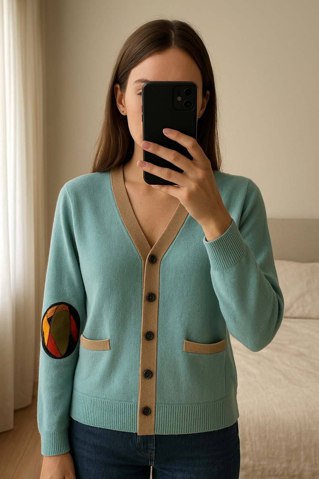 Gilet La Prestic Ouiston debout, face à la caméra, dans une chambre à la lumière douce, avec une lumière naturelle filtrant par la fenêtre.