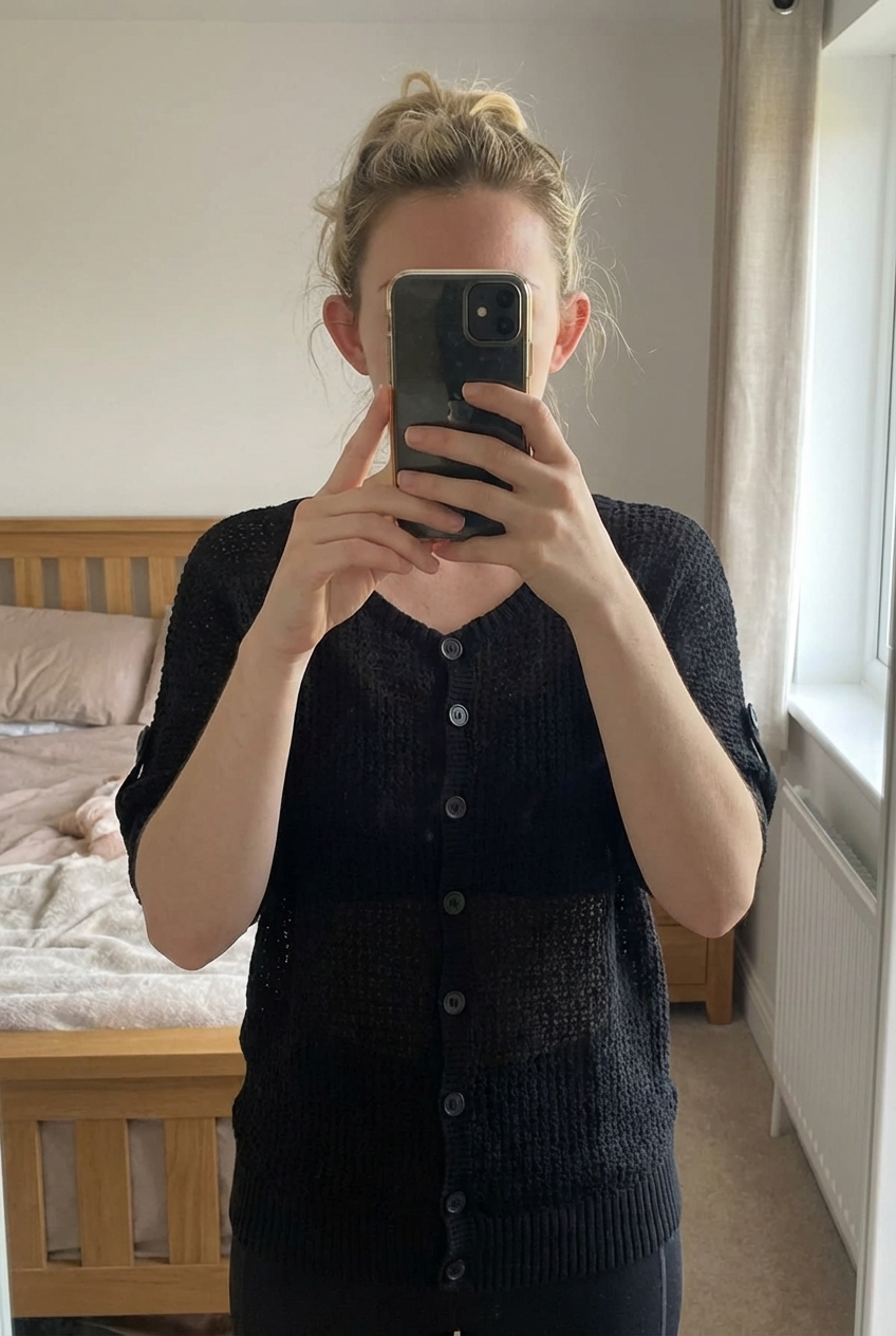 Gilet noir debout, face à la caméra, dans une chambre à la lumière douce, avec une lumière naturelle filtrant par la fenêtre.