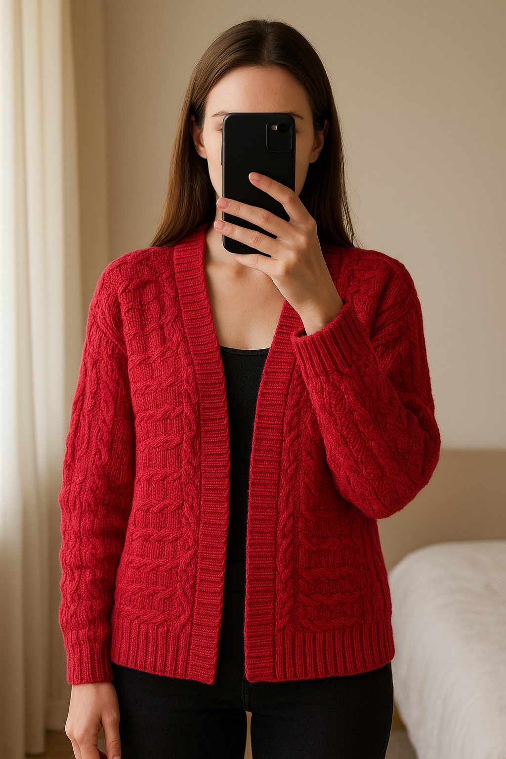 Gilet ouvert femme Ralph Lauren rouge torsadé sans boutons taille M debout, face à la caméra, dans une chambre à la lumière douce, avec une lumière naturelle filtrant par la fenêtre.