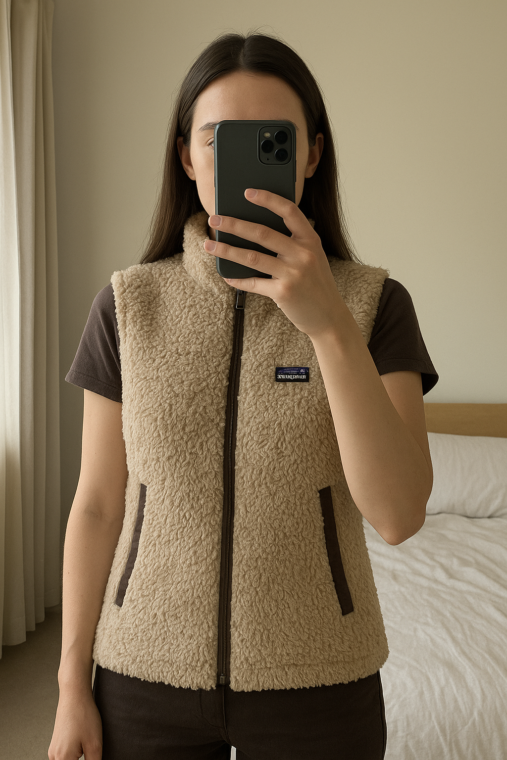 Gilet Polaire Réversible Patagonia Femme – Beige / Marron – Sans Manches – Taille M- SKU 42 debout, face à la caméra, dans une chambre à la lumière douce, avec une lumière naturelle filtrant par la fenêtre.