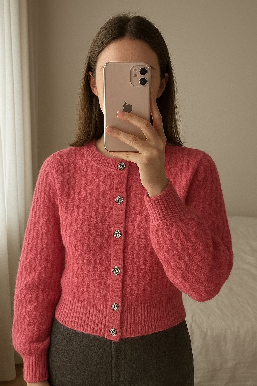 Gilet Rodier mohair rose – boutons bijoux debout, face à la caméra, dans une chambre à la lumière douce, avec une lumière naturelle filtrant par la fenêtre.