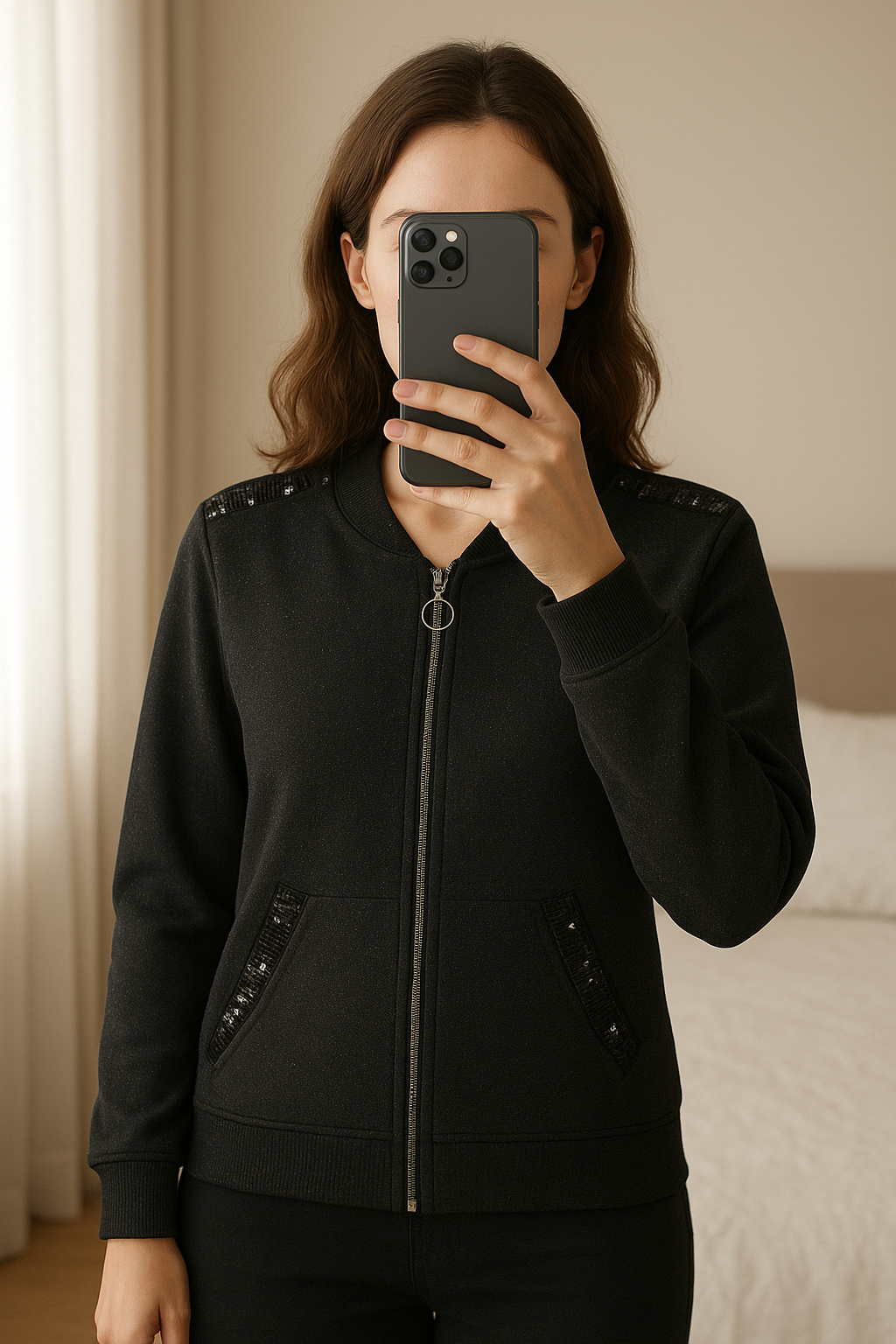 Gilet zip scintillant Barbara Lebek – Neuf 40 debout, face à la caméra, dans une chambre à la lumière douce, avec une lumière naturelle filtrant par la fenêtre.