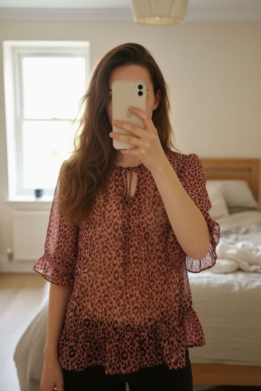 Grace & Mila blouse taille L debout, face à la caméra, dans une chambre à la lumière douce, avec une lumière naturelle filtrant par la fenêtre.