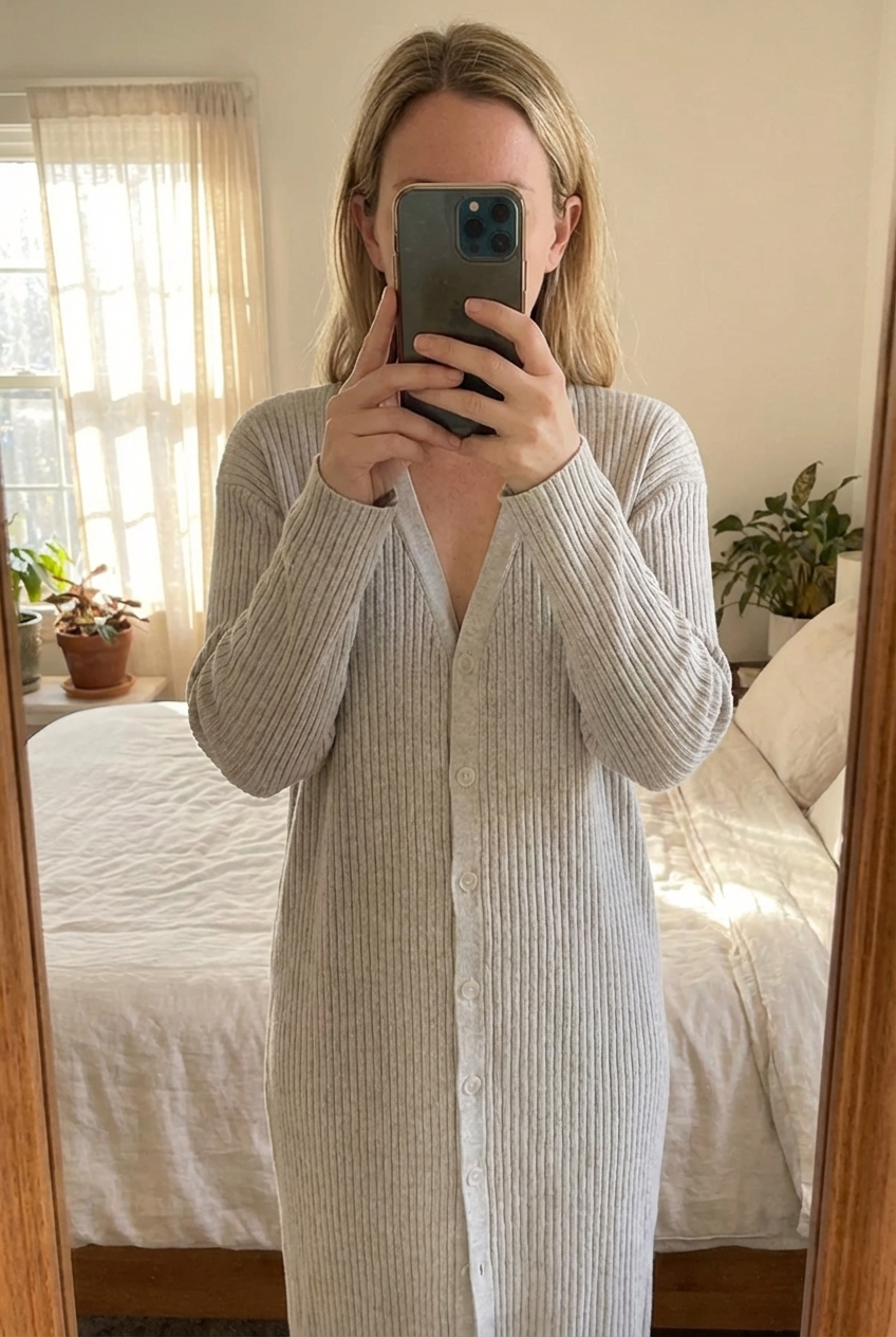 H&M Long Cardigan in soft grey size small standing straight facing the camera, in a softly lit bedroom setting, with gentle natural light filtering through a window.