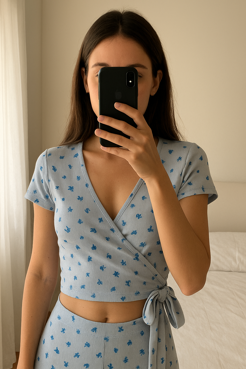 Haut bleu debout, face à la caméra, dans une chambre à la lumière douce, avec une lumière naturelle filtrant par la fenêtre.
