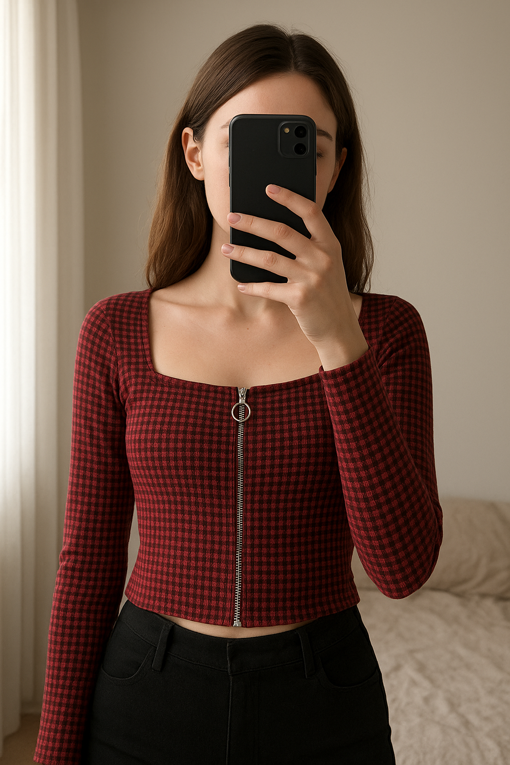 Haut bordeaux à carreaux debout, face à la caméra, dans une chambre à la lumière douce, avec une lumière naturelle filtrant par la fenêtre.
